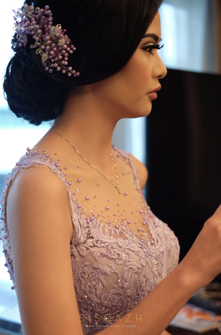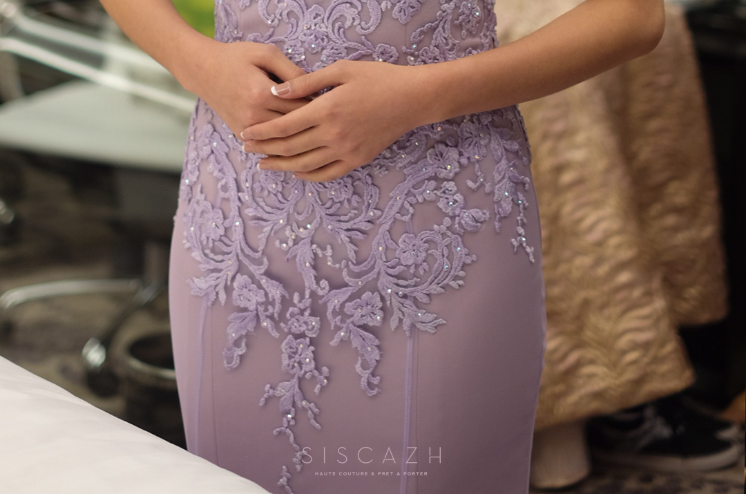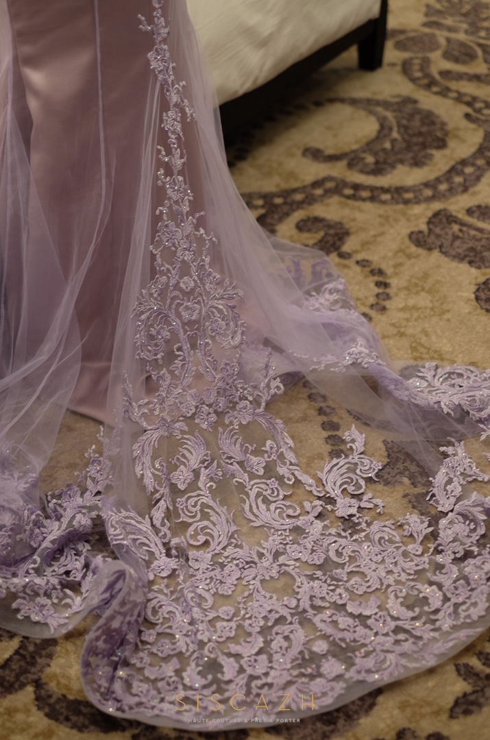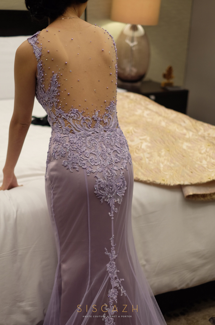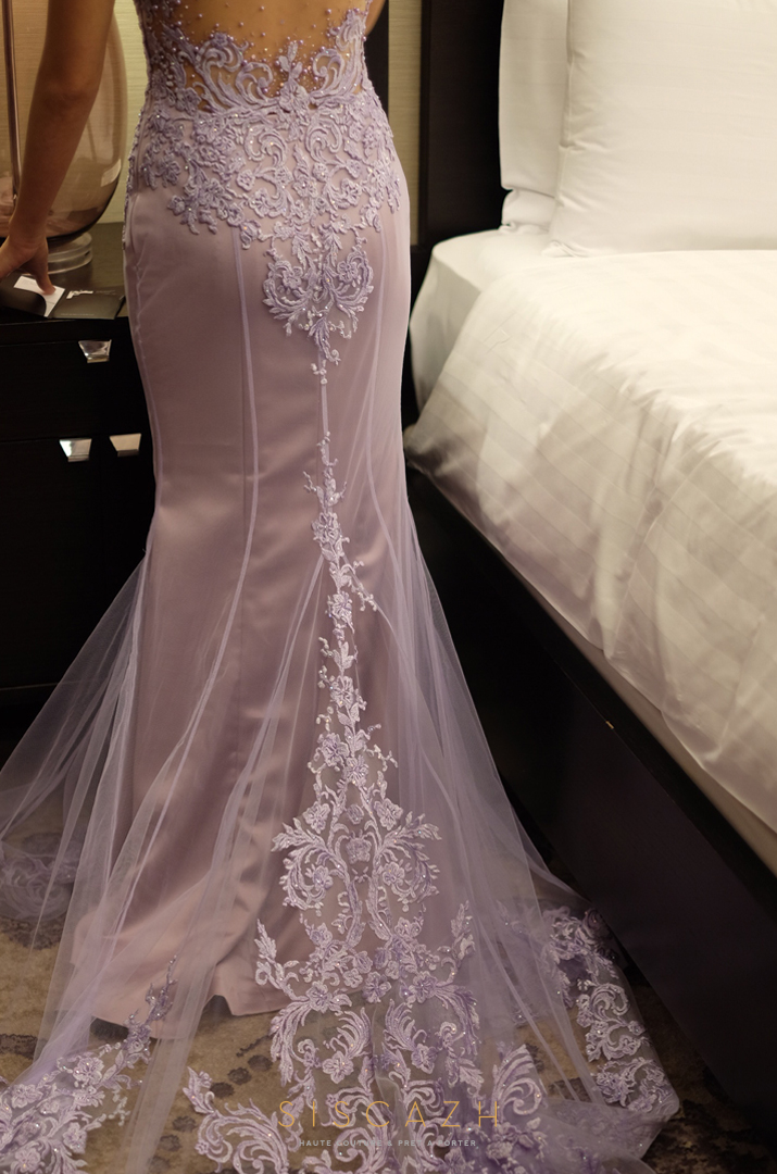 Since Bella has a stunning posture, I immediately recommended her a mermaid design gown to further accentuate her feminine shape. All thanks to her great taste, her selection of a lace fabric in lavender color ultimately resulted in this fabulous backless & modified sweetheart neckline with illusion fabric.